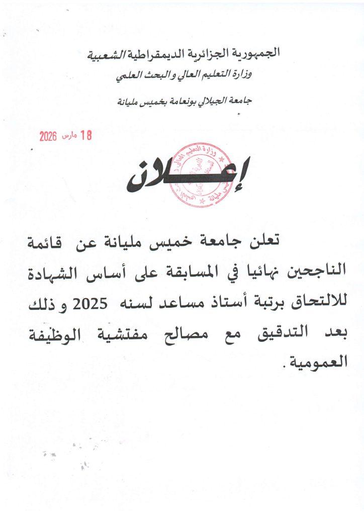 قائمة الناجحين نهائيا في المسابقة على أساس الشهادة للإلتحاق برتبة أستاذ مساعد 18 مارس,2026 admin Last Updated on 18 مارس 2026 by admin قائمة الناجحين نهائيا في المسابقة على أساس الشهادة للإلتحاق برتبة أستاذ مساعدDownload
