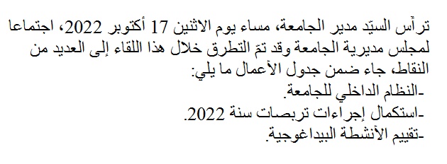 انعقاد مجلس مديرية الجامعة برئاسة السيد المدير الأستاذ برابح محمد الشيخ